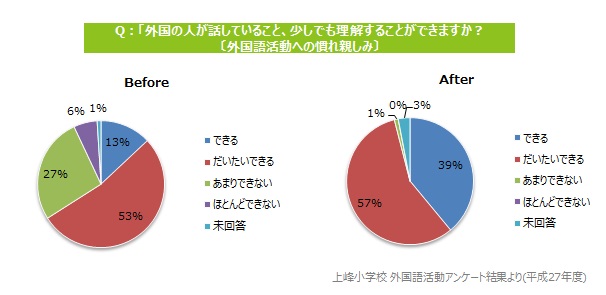 成果:文部科学省が設定する外国語活動における学習評価の3つの観点〔言語や文化に関する気づき〕〔コミュニケーションへの関心・意欲・態度〕〔外国語活動への慣れ親しみ〕のすべての項目について、改善および向上が見られました。外国人講師との会話に慣れることで、自分の話している英語が伝わっているという自信につながりました。さらに外国人講師の話し方や身振り手振りの違いに気付いた児童が多く、文化の違いを実感している様子がわかりました。マンツーマン英会話を通して、発音や話すスピードなどにも慣れ、理解が進みました。(上峰町教育委員会「平成27年度 オンライン英会話学習 成果と課題」より抜粋)