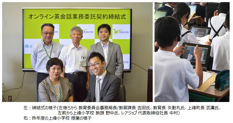 オンライン英会話サービス事業を運営する株式会社レアジョブ(本社:東京都渋谷区、代表取締役社長:中村 岳、以下「レアジョブ」)は、佐賀県上峰町(町長:武廣 勇平)と、2016年8月18日、上峰町立上峰小学校における、オンライン英会話授業の実施に関する業務委託契約を締結しました。