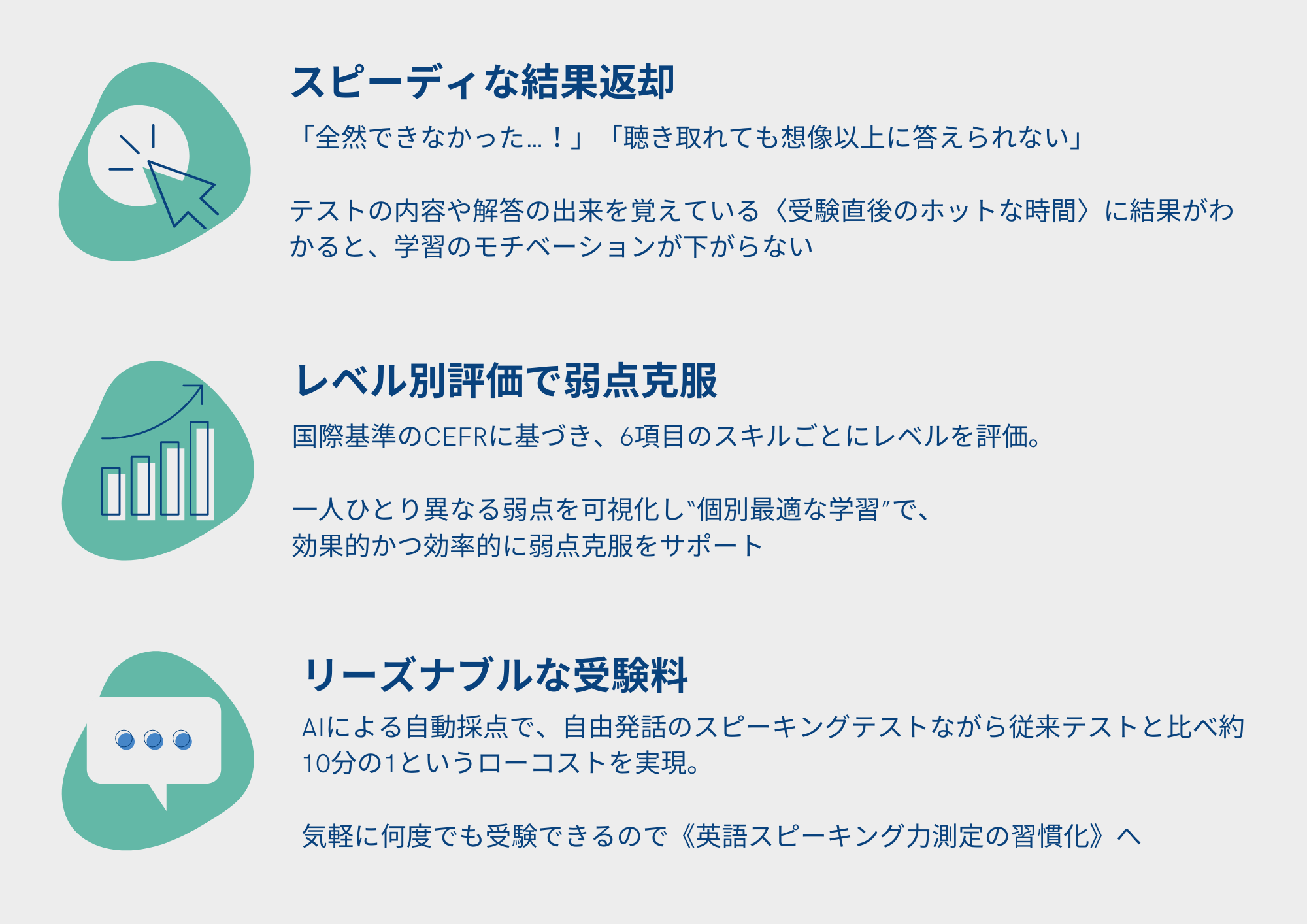 AIの自動採点で受験料をリーズナブルに抑えたのは、気軽に何度も受験できることで英語スピーキング力測定を習慣化するため。