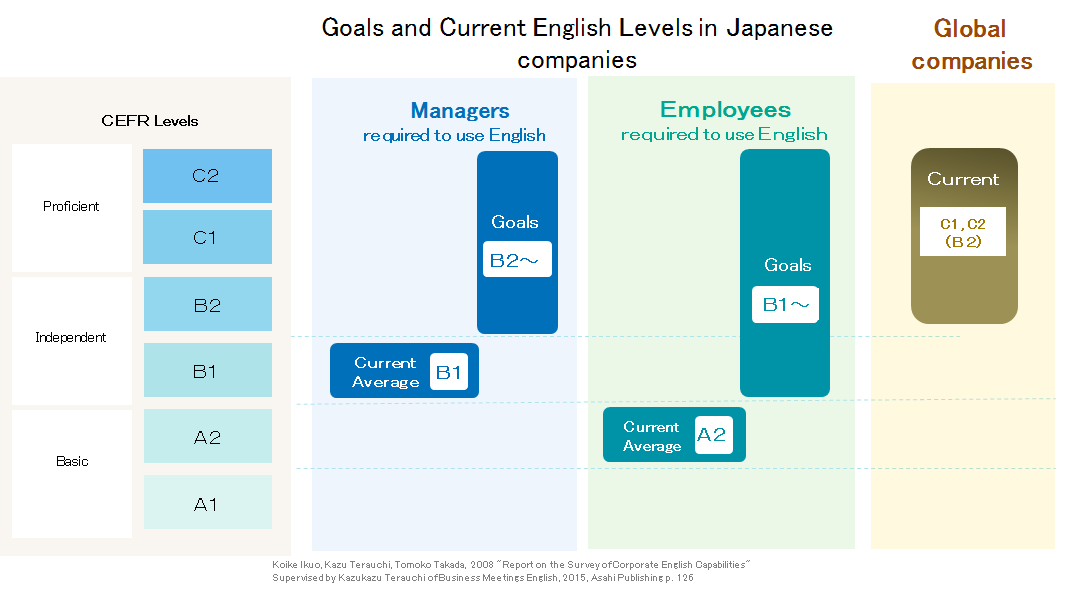 CEFR level B2 or higher is required for admission to foreign universities. Global companies set their English requirement for hiring as B2 at the lowest, or, as C levels in many cases. Just imagine that this is the English skills of Japan’s global competitors. In Japan, however, there are not so many business persons who have a B2 level, and B1 level is generally set as a goal for English based jobs and overseas assignments.