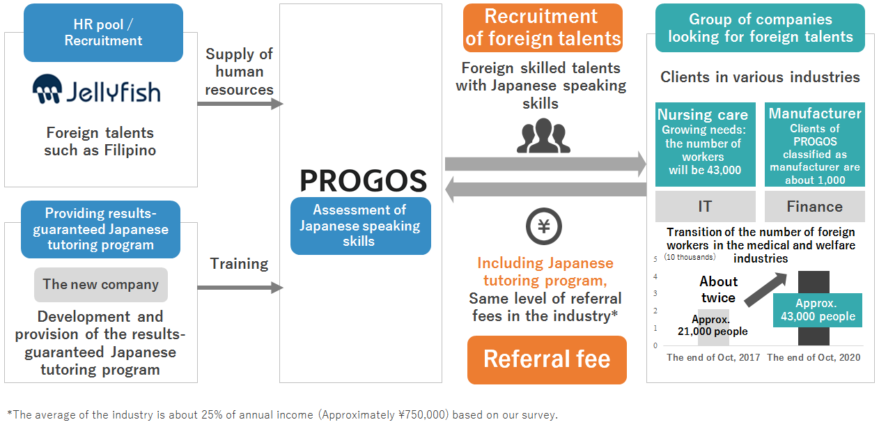PROGOS and JELLYFISH will establish the new company to develop Japanese tutoring programs together and start the development. In addition, we will build the seamless system to introduce suitable foreign workers from foreign talent pool to companies and to develop and provide Japanese tutoring programs.