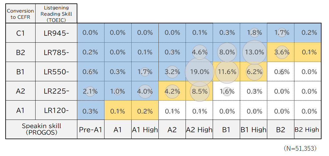 *** Calculated from data of 340,000 Japanese test takers out of 420,000 PROGOS® takers. It does not represent the English speaking skill of Japanese people as a whole