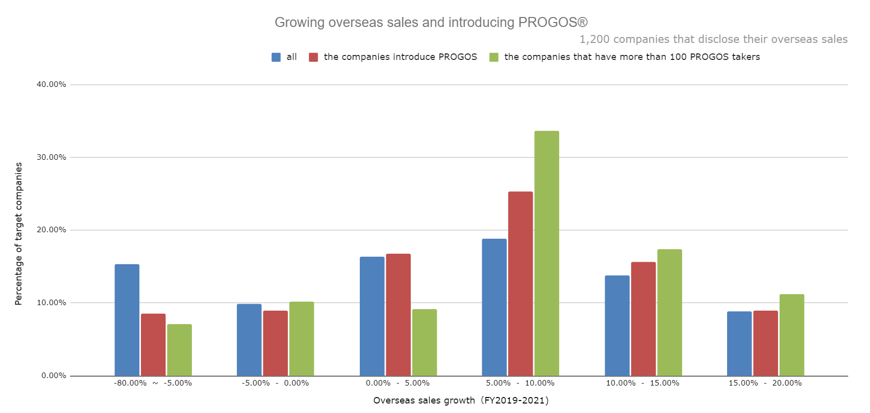 We also investigated the relationship between the growth of overseas sales as an indicator of a company’s progress in globalization and their staff’s English speaking skill. Based on data from approximately 1,200 companies that disclose their overseas sales, we compared the average annual growth rate of overseas sales from FY 2019 to FY 2021 and the companies that used PROGOS® from June 2020 to the end of May 2023, and found the following.
