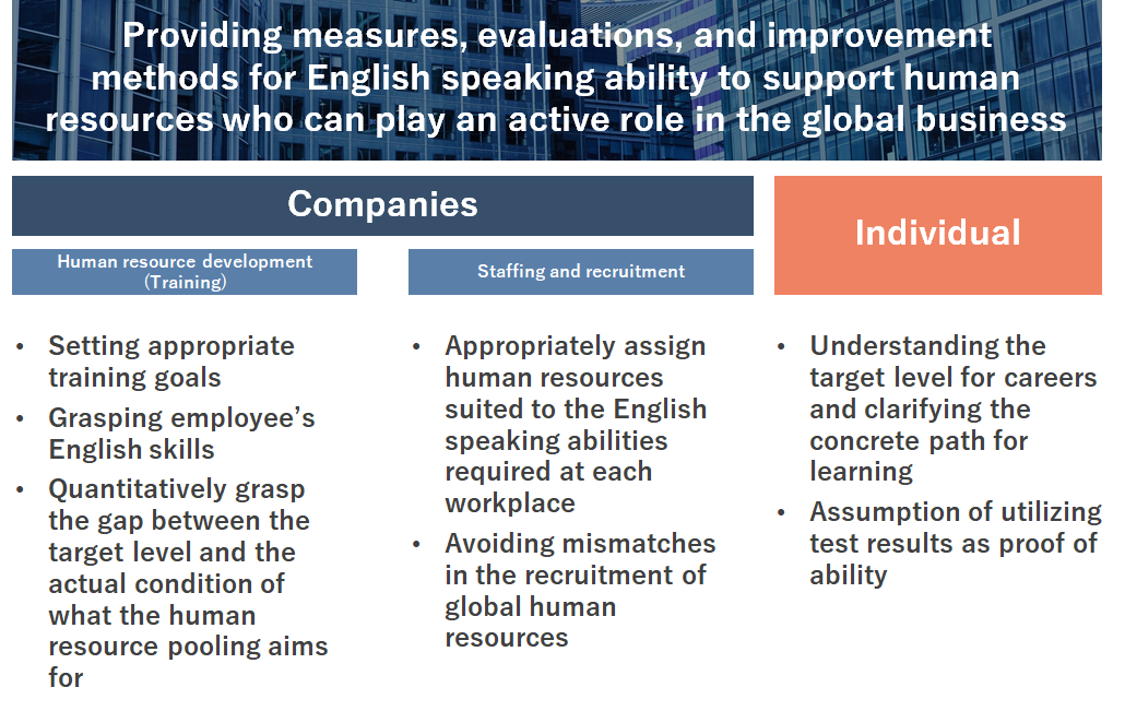 In addition, the coming of “with Corona era” has greatly accelerated the introduction of ICT in business situations. With the spread of remote work and the promotion of job-based human resources, there is a growing tendency to place greater emphasis on output and results than in the past. In addition, it will become difficult to communicate with face-to-face, including traveling abroad, and it is expected that collaboration and management with foreign employees will be required remotely. Given these social conditions, it is necessary to use English not only for overseas business trips and overseas postings, but also for every business situation, and the tendency to place greater emphasis on “being able to do business in English and deliver results” than before is expected to increase in the future.