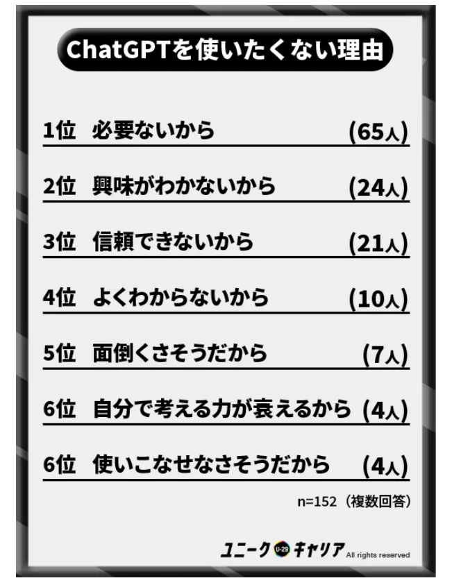 A survey showed that some people answered, “I don’t understand what ChatGPT is like”, and “I cannot seem to make use of it” as the reason why they don’t want to use ChatGPT. It means that many people think it sounds difficult. Most people answered that they don’t need ChatGPT, but the reason for the answer can be that they may not be able to imagine how to use and recognize its necessity and possibility.