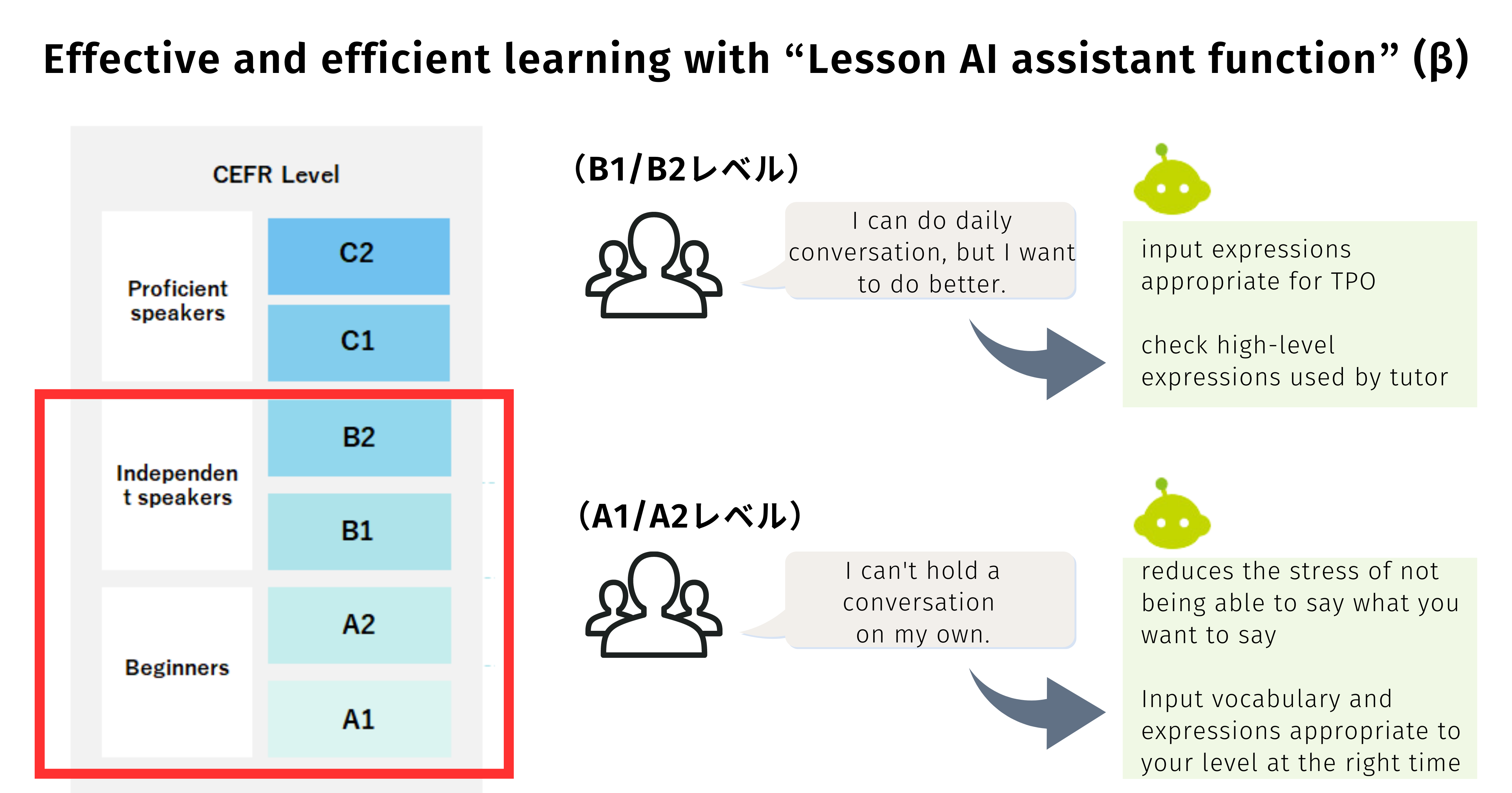 From the perspective of second language acquisition theory, the use of AI during lessons is expected to contribute to learning effectiveness. The following are the expected learning effects depending on the proficiency level of English conversation skills (CEFR, the international language standard).