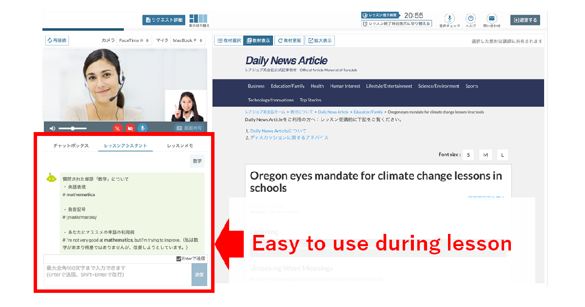 This feature will automatically display words and expressions that match the level of the student based on the results of the “RareJob Speaking Test powered by PROGOS®”. For this reason, students who have taken the test may be informed of this feature ahead of time.