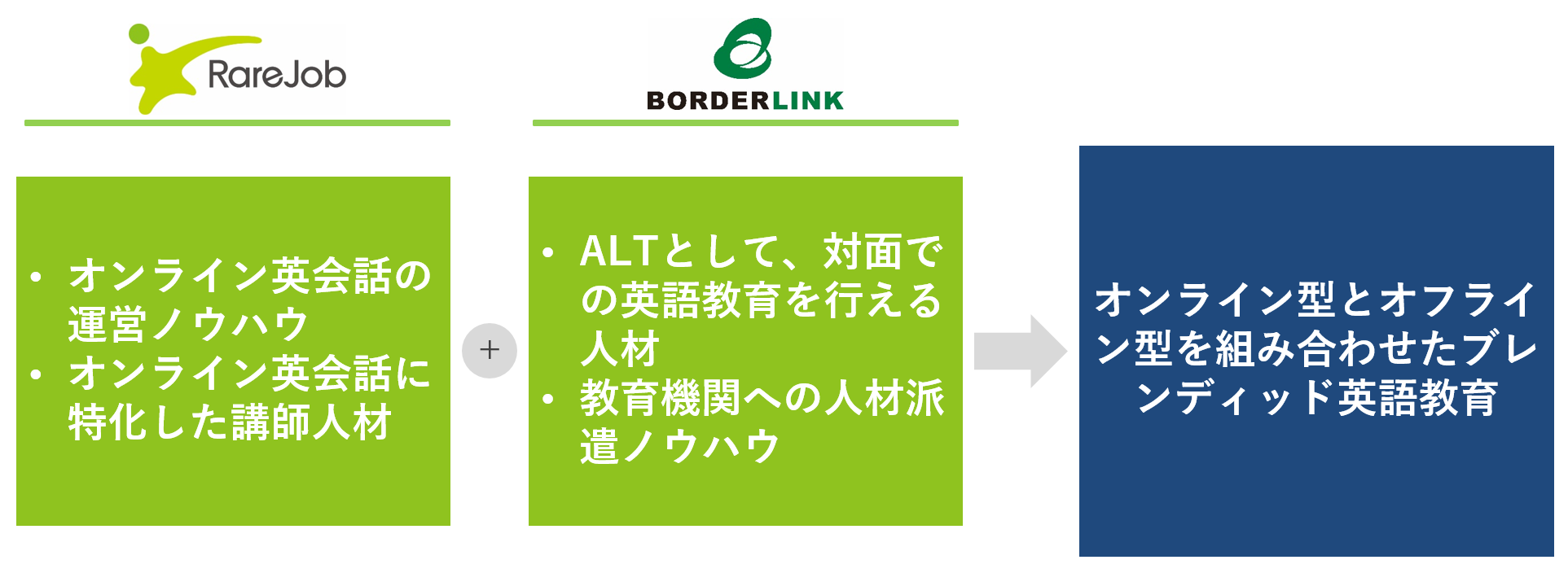 戦略実行に向けアライアンスの可能性を模索する中で、レアジョブは2021年10月にボーダーリンクの発行済株式49%の取得を行いました。これまで、レアジョブが持つオンライン英語教育ノウハウと、ボーダーリンクのALT*2によるオフライン英語教育ノウハウを組み合わせた教育の実現に向け協業を進めてきた中で、両社の事業シナジー創出と、さらなる事業拡大の可能性が見込まれることから、ボーダーリンクはレアジョブグループの文教事業における新たな改革を推し進めるパートナーであると判断するに至りました。そして、このたびボーダーリンク株式の追加取得を行い、完全子会社化する運びとなりました。