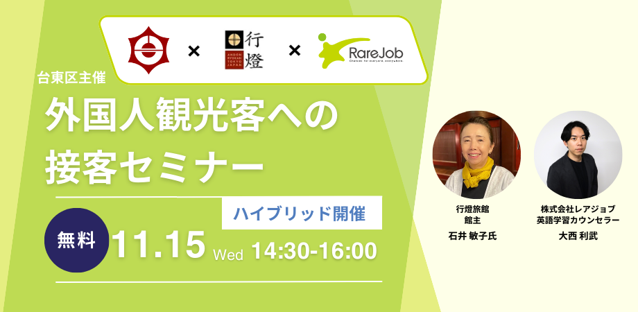 EdTechカンパニーの株式会社レアジョブ(以下、レアジョブ)は、台東区が主催するセミナー「外国人観光客への接客セミナー」に、英語学習カウンセラーの大西が英会話講師として登壇することをお知らせいたします。