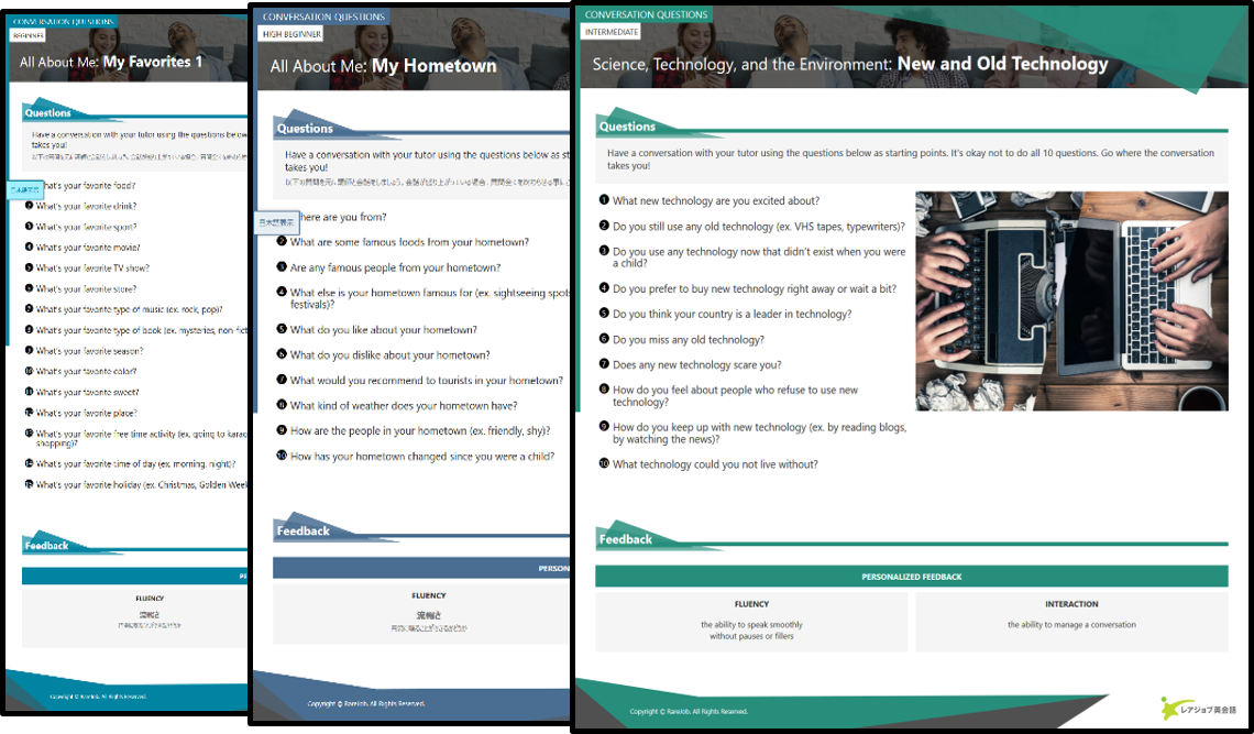 一番人気の上級者向けニュース記事教材『Daily News Article』の姉妹教材である『Weekly News Article』を新たに追加し、初・中級者向けのディスカッション教材を拡充。また、二番目にレッスンとして多いのは教材を使用しないフリーカンバセーションです。これをふまえ、今まで講師のみが持つ教材として展開していたスモールトーク教材『Conversation Questions』をリニューアルし、テーマや質問リストを拡充させ、学習効果が得られやすい内容にすることで、カジュアルな会話でも、伸びを実感できる教材になりました。
