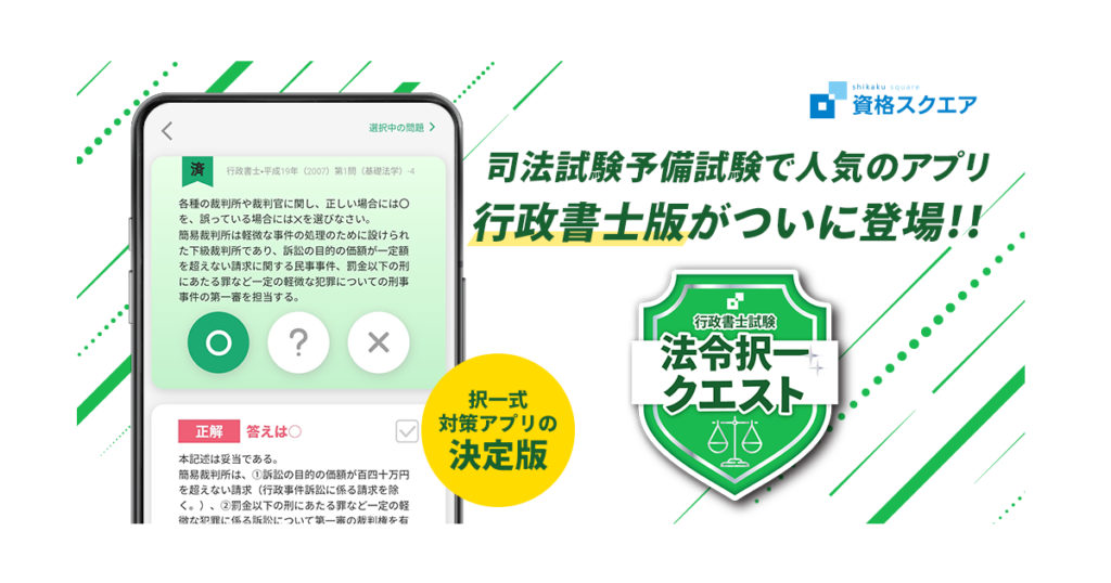 スキルの可視化と向上を支援する“AIアセスメントカンパニー”の株式会社レアジョブ(以下、レアジョブ)の資格試験対策事業子会社、株式会社資格スクエアは、行政書士試験の択一法令科目の過去問を演習できるアプリ「法令択一クエスト」(以下、本アプリ)をリリースしました。