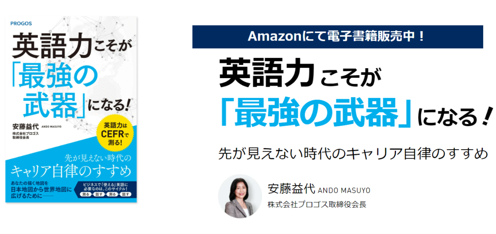 人にまつわるデータを活用し、グローバルに活躍する人々を生み出す株式会社レアジョブ(以下、レアジョブ)の法人向け事業子会社、株式会社プロゴス(以下、プロゴス社)の取締役会長 安藤 益代による著書『英語力こそが「最強の武器」になる!先が見えない時代のキャリア自律のすすめ』が2022年4月12日に電子書籍としてAmazon.co.jp(*)で発売されます。