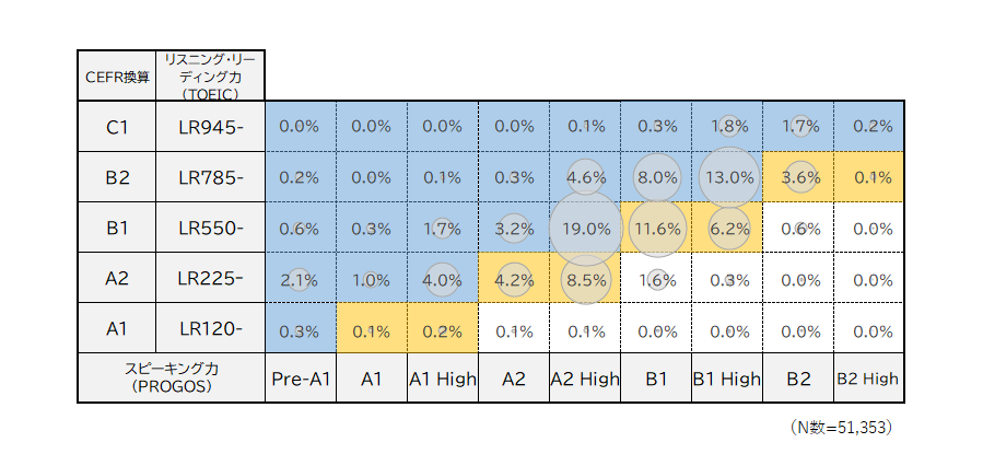 ビジネスで英語を使うにあたっては、英語4技能(「リスニング」「スピーキング」「リーディング」「ライティング」)を使いますが、特に商談や会議などで適切なコミュニケーションを取るために「話す」力が非常に重要になります。そこで、よく受験されているTOEIC®L&Rと「PROGOS®」の両方を受けた人の受験データを活用し、技能間の比較分析も実施いたしました。