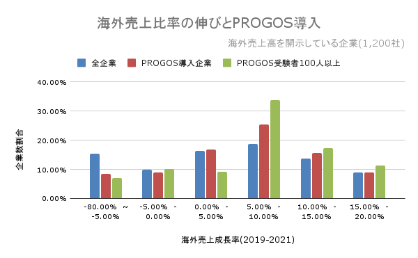 ・企業数では海外売上高の年平均伸び率は5~10%が最多であったが、このレンジで「PROGOS®」を100受験以上大規模に導入している企業の比率は圧倒的に多い。また何らかの形で「PROGOS®」を導入している企業の割合も多い。