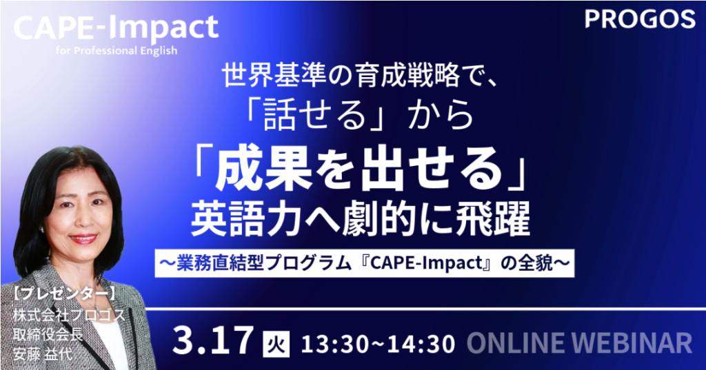 EdTechカンパニーの株式会社レアジョブの法人向け事業子会社の株式会社プロゴスは、2026年4月1日より本格提供を開始する業務直結型プログラム「CAPE-Impact」の人事担当者向けウェビナーを、3月17日(火)に開催します。本ウェビナーでは、新プログラムの設計思想に加え、先行利用いただいた企業様の事例を初公開いたします。
